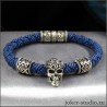 Браслет, вручную сплетенный мастером из высококачественных паракордовых шнуров синего цвета. Браслет держит форму, не выцветает, не ворсится, устойчив к воде. Череп, шармы и замок, отлиты методом ювелирного литья из аргентана цвета серебра, покрыты благородной патиной, до блеска вручную полированные. Украшения литые, крепкие, устойчивы к царапинам. Замок...
