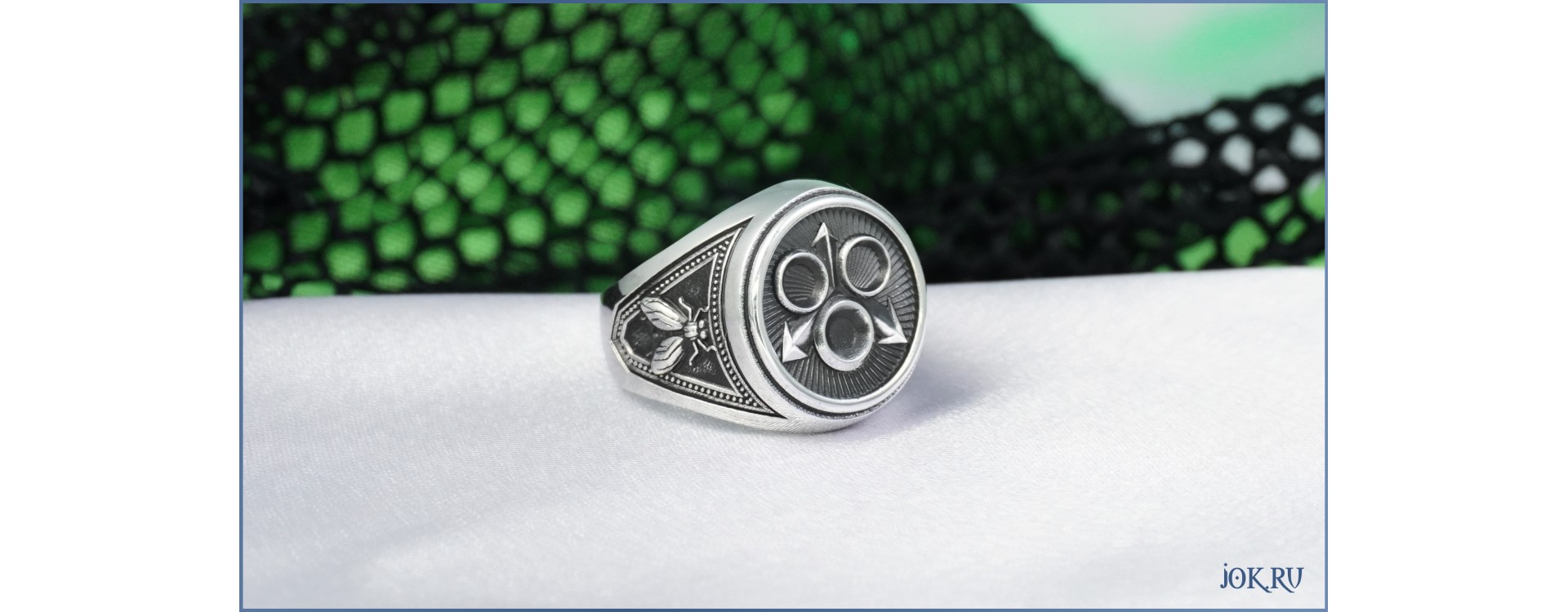 Кольцо изготовлено методом ювелирного литья. Эта технология, позволяет передавать идеальное качество всех мелких деталей кольца. Перстень покрыт благородной патиной, которая подчеркивает контраст углублений и узоров, создает объем и выразительность.