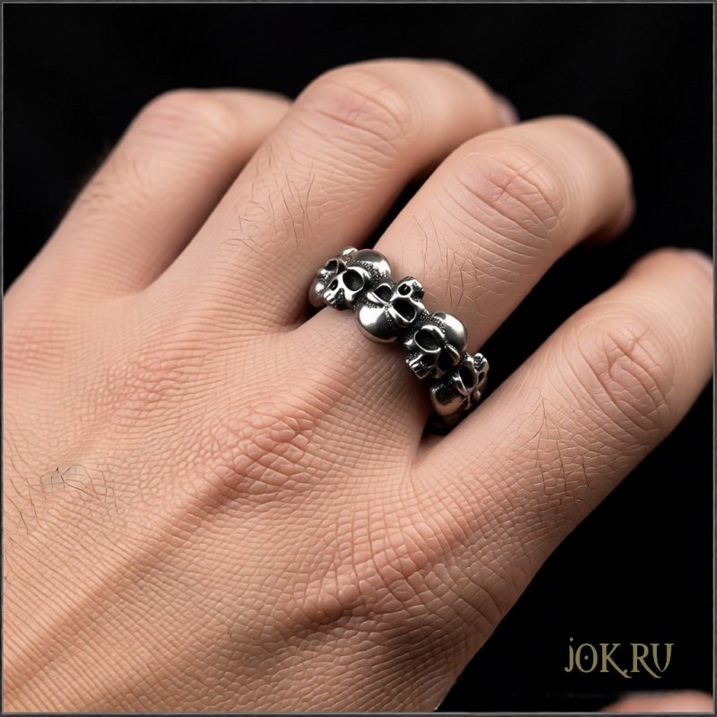 Мужское кольцо с одиннадцатью черепами отличного качества из ювелирного сплава - аргентан. Ювелирный сплав, долговечный и практичный, который будет долго сохранять свой первозданный вид.