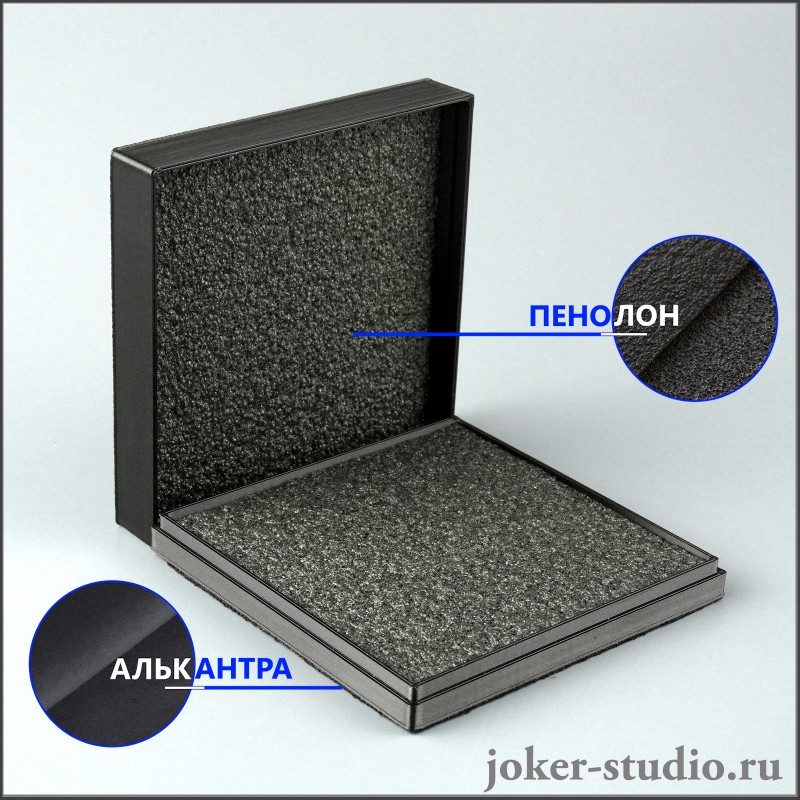 Внутренняя отделка из пенолона, который надежно защитит изделие от повреждений и царапин. Внешняя нижняя часть обтянута алькантарой (искусственной замшей) — приятным на ощупь материалом, придает коробке изысканный вид, не теряет свой внешний вид с течением времени.